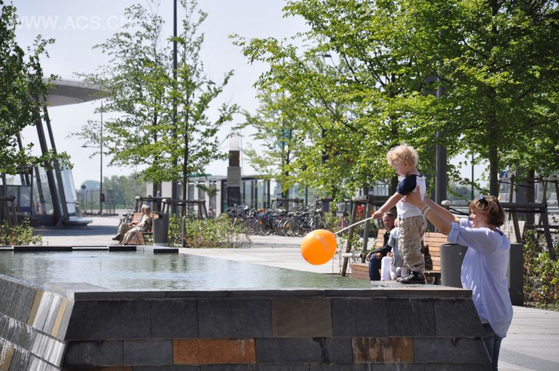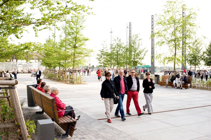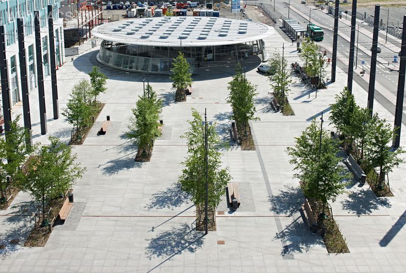 Hyllie 广场是一个城市广场,它被设计成风格化的山毛榉林。树林里12条固体花岗岩的裂缝中栽种了28棵高光泽成熟的山毛榉树。为了在这种人工条件下获取山毛榉繁茂的敏感树种,该广场中心地表被用来做研究项目,得益于其大量结构性土壤,包括浮岩、菌根和木炭等。这些树依据将来可能成为的社交地点进行分组,以在森林里创建空地。在夜晚,16米高、1800米长的带有2 800个发光二极管的钢丝创造出了一片数码天幕。这个天幕被规划成7个场景,其中有对应四季的场景。