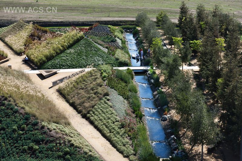 中央是一个9英亩的公园,作为校园社交中心,由体育场、游乐场、足球场、植物园、水景和露天舞台组成。每个场所都有通向中央绿地的入口和景观指示,密切了建筑物与景观之间的联系。景观密布的场地和屋顶花园也融入到这个整体中,一些受推崇的有着历史意义的建筑用来出租,方便人们接近加利福尼亚南部著名的户外环境。