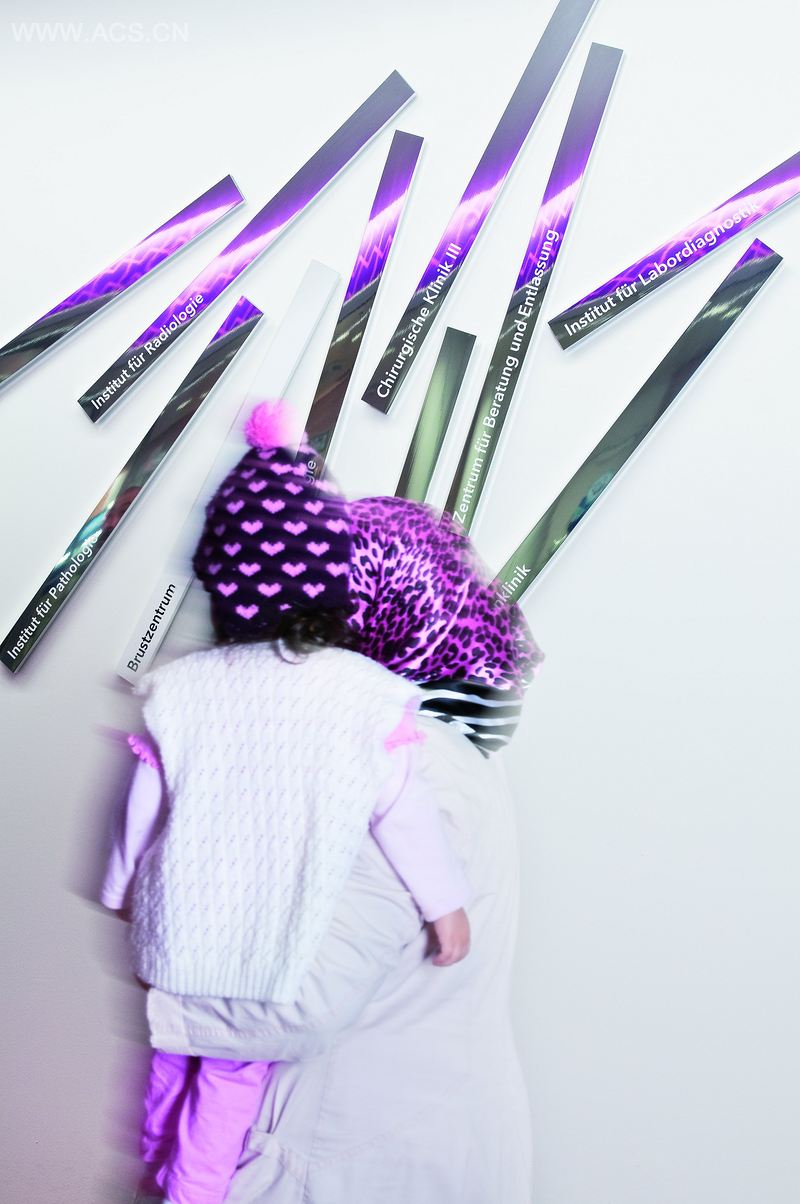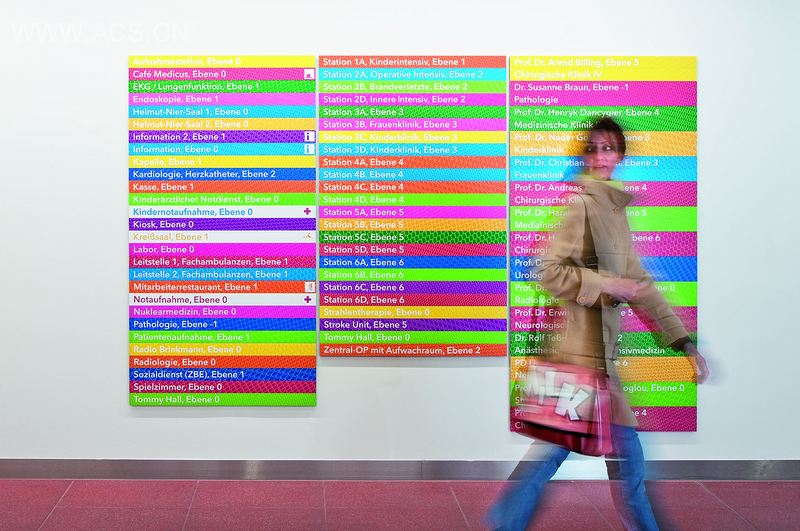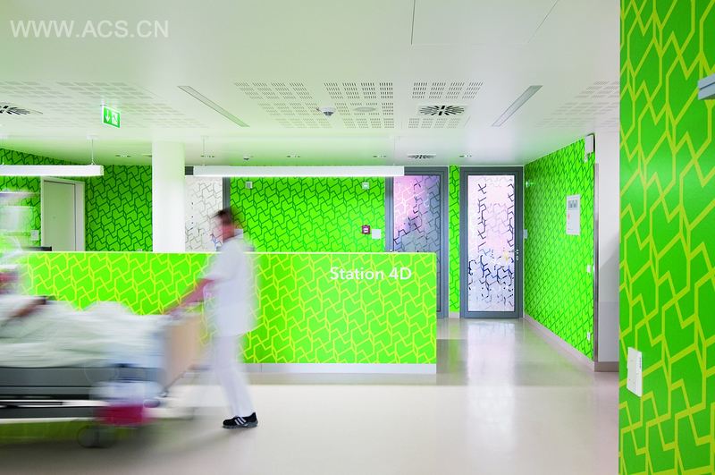 几何着色图案引导访问者到达目的地而且使人心情明亮。每个地方都有其图案排列并用颜色区分开。因此,每个访问者可以辨别他们的颜色和图案,并借此引导他们在复杂的医院内穿梭。