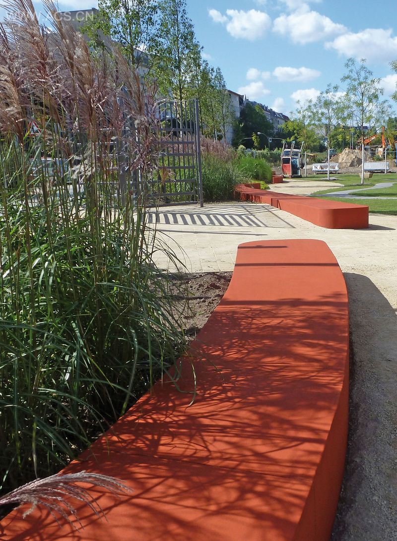 建筑西边是游乐场,为小孩及成年人开展各种游戏和活动提供机会。该设计考虑到很多因素,如一条波浪形的单车道、板条箱、货运站曾经利用过的木箱塔、组合秋千、秋千摇篮和一个鲍比汽车赛道。公园北边地形有些坡度,这样就形成了一个“阳台”。地势较低的南边是一大片草坪/野花草地,开发成了一个种植着水果树和灌木的果园,可以为居民带来收益。