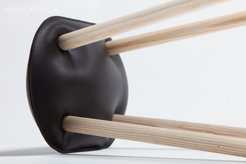 The idea originates from the image of a prominent belly, constrained by the belt, but still comfortable at it fills a round shape around it. This stool is a dialogue between a rigid structure and a flexible skin.