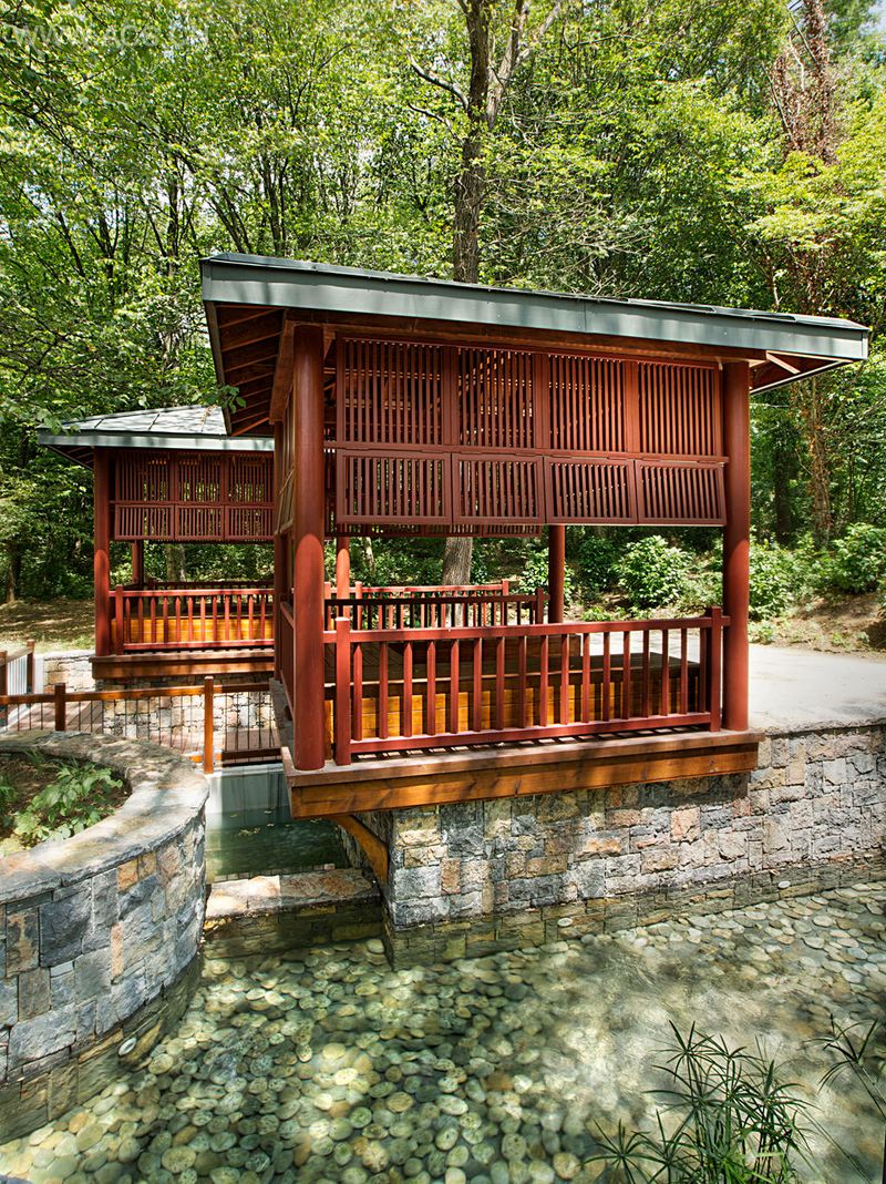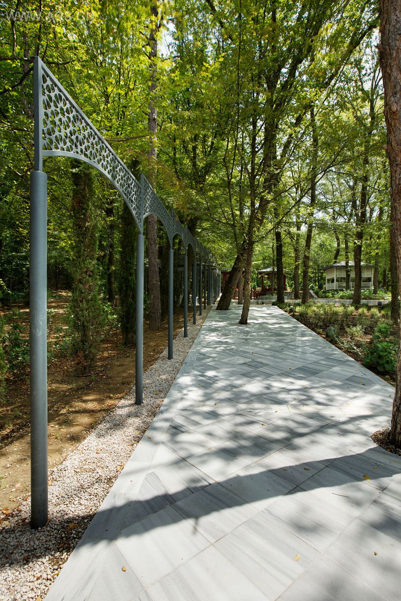 土耳其园林的设计旨在为婚庆及鸡尾酒会这类活动提供开放的空间场所。这里设计了两栋建筑以方便人们冬天里使用园林。这些结构简洁的建筑物的位置是根据当地已经存在的树木来定的。园林入口处是由鹅卵石和横木制成的小路,接着是正式的大理石道路,沿途是有着现代土耳其气息的金属拱廊和柏树。路的尽头是一座将自然环境与两个木制楼阁连接起来的木桥