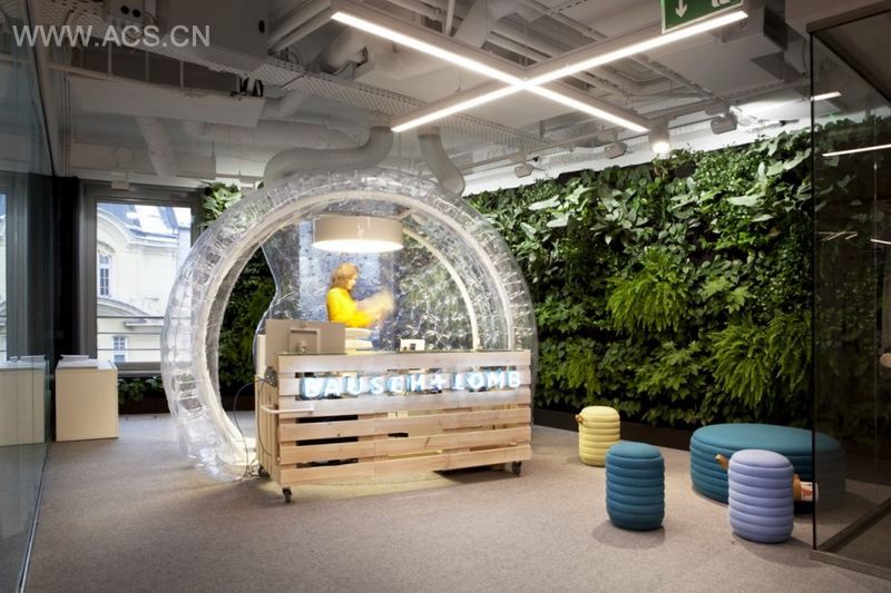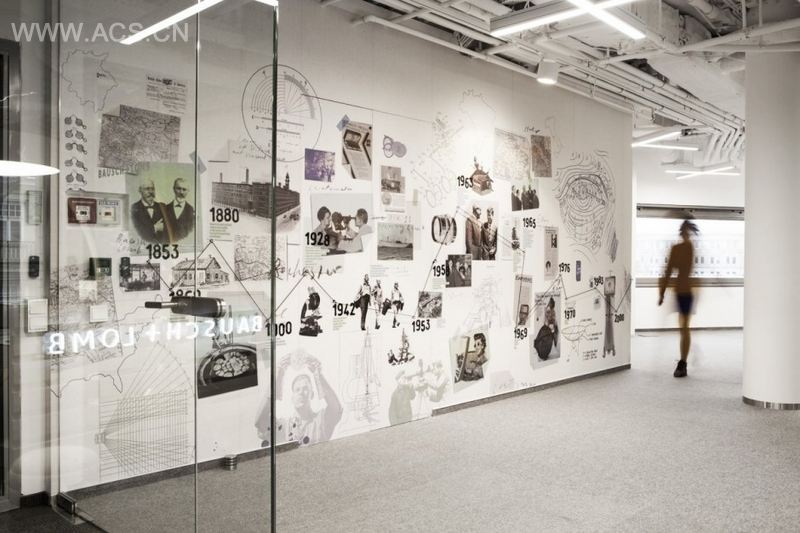 Research labs and contact lenses – the client’s main product – served as our inspiration. White exposed ceilings combined with glass surfaces combine to create a light and transparent space. This seemingly sterile aesthetic is balanced by green walls along the space’s main visual axes and functional solutions which encourage teamwork and relaxation.