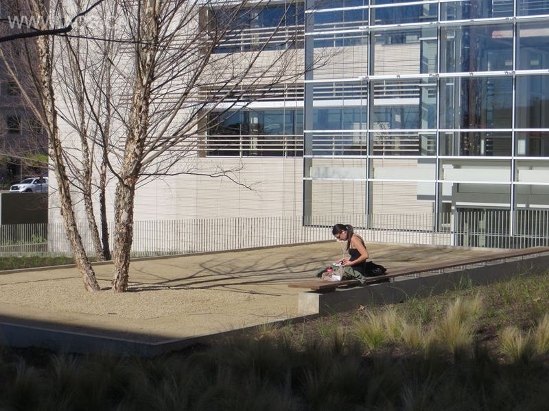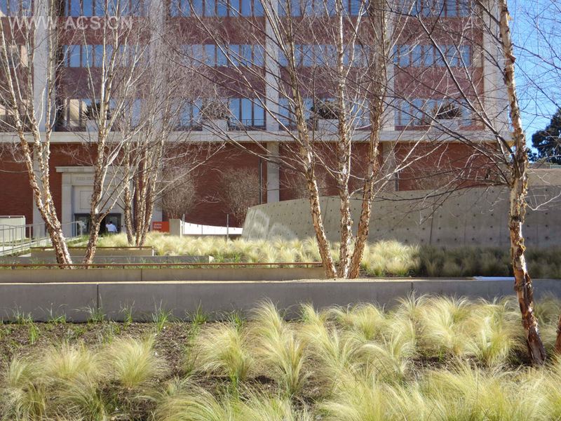 位于加州大学洛杉矶分校医学院的伊迪和卢瓦瑟曼建筑,设计者是Richard Meier 及其伙伴。他们不久将要改造Jules Stein眼科研究所。新的研究和护理设施造就了能将研究所现有的建筑联合起来的室外居室。为了区分瓦瑟曼建筑里的复杂区域,一项受约束的处理方法被实施在景观的设计中。由于很多访客是视力有问题的,一个最值得注意的设计被用来吸引人的听觉和嗅觉。这里设有聚会场所,允许员工和病人从日常医疗设施的压力中抽离出来。