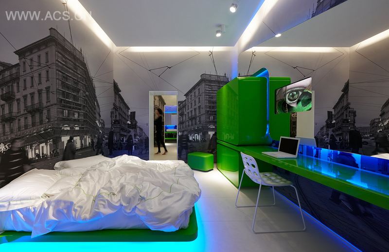 这个项目位于米兰,但它的设计意图带领人们漫游整个世界的大都会。它位于一块商业用地之中,也就是戈尔多尼大街33号1楼,它如今已改变为一间面向街道的高级酒店套房,里面没有接待室,完全是自动化操作。这间旅馆的设计概念由阿里桑德罗·罗索提出,并由建筑师西蒙·米凯利实施工程,旅馆内一共设计了4个套间,它们都遵循了原始的设计理念和造型构思。当代的新酒店理念就这样融入进了这些被遗弃的都市空间中。正规酒店的刻板形象在这里完全被否决了:接待室、门厅、楼梯、电梯和走廊都被省略了。顾客能从每间单独的套房里直接眺望到城市的街景,而且每间套房都有一个面向街道的独立玻璃门入口。宾馆采用了字母数字键盘的电子控制技术,因此顾客可以直接在网上预订房号。