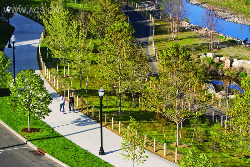 OLIN制定了蓝图,对公园进行分层次,多样化,可持续性的规划。河流规划方面有四个显著的主题:自然/生态、文化/教育、娱乐、体验。公园会给斯坦福德市中心的河边地区营造一个活跃、充满生机的绿化环境。同时它将邻居们与河流联系起来,使之成为一个显著的、充满吸引力又能让整个社区接近的场所。河岸边的道路可供散步和慢跑,同时为路人的休息和欣赏风景提供了多样化的场地。 后期会增加旋转木马、咖啡馆、喷泉、溜冰场这些设施,提供全年的休闲、娱乐和消遣,增加节庆和社会活动的氛围。 河岸及斜坡上有种植带,能持久抵御暴雨的侵袭。本土植物包括草地、野花、灌木、下层木、树冠木,它们被精心的布局用来恢复那些退化了的水陆栖息地。另外,这些合成的栖息地为学生和观鸟爱好者提供了学习的机会。