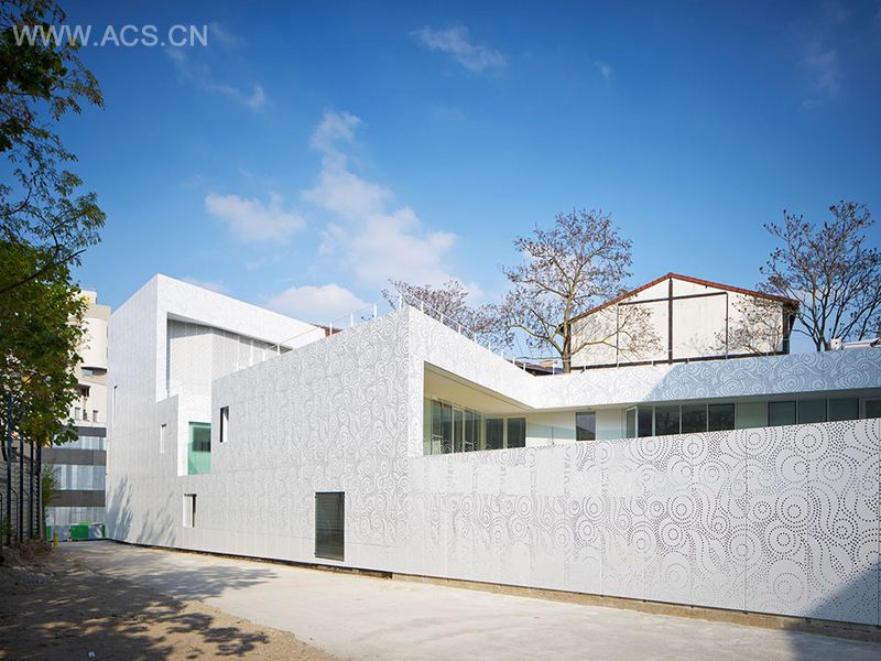 法国建筑事务所Avenier Cornejo设计的巴黎20区幼儿园建成,这所可容纳66个孩子的幼儿园是一座独特的建筑,为儿童提供安心的环境。建筑以混凝土为结构,满满占据着三角形地块,并沿两侧边缘开了三个内庭院,为建筑提供充足的阳光与光线。建筑周身覆盖有着美丽花样的金属穿孔板。这层金属外表皮还覆盖了部分窗户,为其提供过滤的光,并在夜晚像灯笼一样透光。