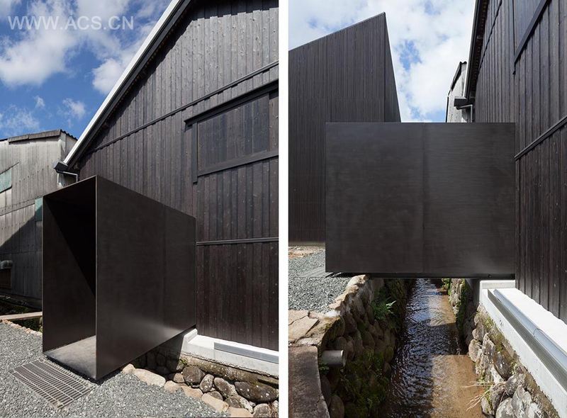 建筑师接到委托要将酒厂早已改装成仓库的碾米厂房改造成为一个展览空间,向游客提供展览和美酒品藏。建筑师修正和加固了原有建筑的结构,并将其精心的保留展示,又在内部空间中植入一个展览盒子,盒子的墙面开着让新老空间彼此联系的洞口,顶部天花也开着可以直接看到老屋顶结构的洞口。墙面一侧安装了4.5毫米厚的黑色钢板陈列架,美酒将放置在这里。此外,游客还可以通过楼梯上到盒子的顶部,感受老建筑古老而优美的木结构。