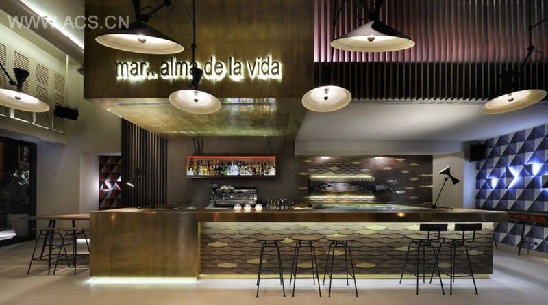 The café bar –O13 (ocean thirteen) is located in one of the most advantageous position in the city of Thessaloniki. In the city center in Aristotelous Square, under the gallery which was designed by Ernest Hébrard is facing the coast. It is viewing the Thermaikos Gulf, the port, the Aegean Sea, the Mediterranean Sea and our thoughts to the “ocean”. Communicating vessels with the “water” being the basic element to this interaction, like the trends-the waves of art of the fashion of the design each season.