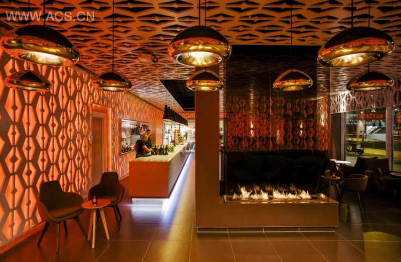 “We have noticed that many great espresso bars are only open during day time which seems odd to us considering the Dutch hospitality industry. We saw great potential as it is almost natural to Dutch customers to have a late afternoon drink after their coffee” explains owner Michelle Xu. The biggest challenge of the interior design was incorporating the transformation from day to night. The answer was found in the usage of light. The walls and ceiling are covered with a pattern of panels with light behind it. During the day, the intensity and color of the light can be adjusted to the mood and time to make the transformation from day to nighttime visible. Breakfast is marked by bright green and blue colors while the bar turn orange and red at night, just like a sunset. The twelve meter long bar is also a great gesture in the space. Not only is it multifunctional with a cocktail counter, food section and beverage showcase, it also gives the space direction.