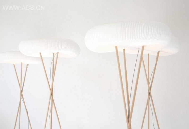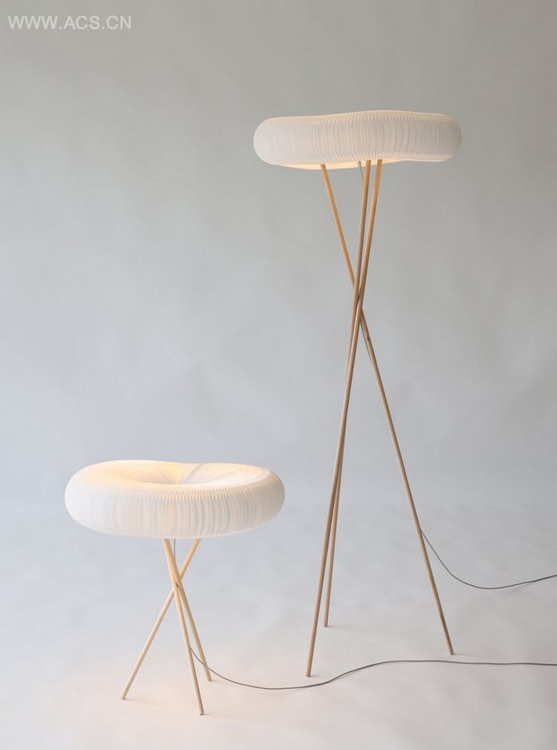 Beneath the textile shade, the visually delicate, demountable wooden s of cloud floor + table softlight make clever use of a flexible and hidden connection to elegantly join each of it’s three legs together.