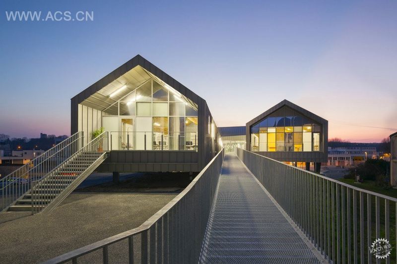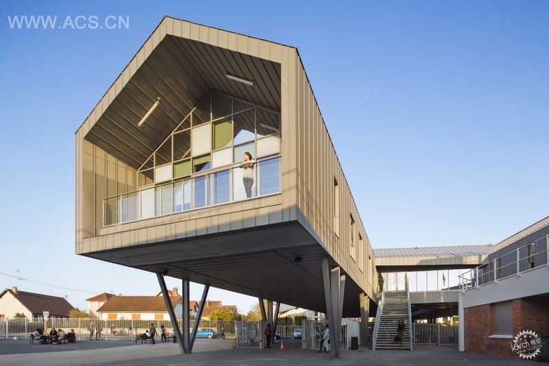 由于它所处的位置和它统一的功能,这座桥梁成了新高中的标志和象征,也是整个建筑的焦点。桥梁穿过服务于学生的空间(学校生活、家庭、自习室……),这些空间和两个操场直接相连。服务于教员的空间则靠近两所学校的行政区域。