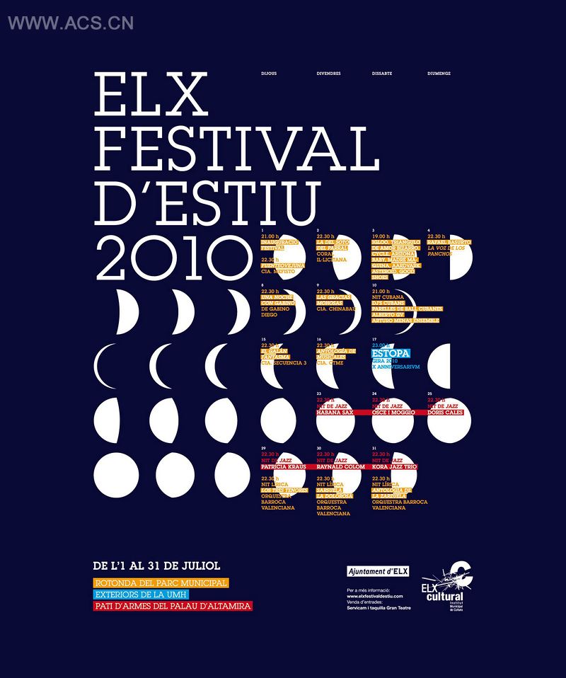 在为这个盛夏的节日搜索标识的时候,我们注意到这个节日涵盖了多种多样的表演节目:爵士乐、摇滚乐、流行音乐和戏剧。因此,我们面临的挑战便是如何设计一种涵盖这所有群体的独特风格的标识。我们发现了这些节目的一个共同的特性——它们都是在夏季的七月、洒满月光的露天下进行的表演。于是,我们便专注于设计一个农历的图形元素来与节目的内容相呼应,并且以最适合各种媒体宣传的方式在全市呈现。