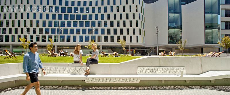 悉尼科技大学校园绿地是悉尼科技大学市中校区最为重要的公共开放空间。悉尼科技大学因其二十世纪六十年代的“野兽派风格”高楼而闻名,而高楼也是校园的核心建筑之一,但在这里,学生在绿色景观空间学习及社交的机会却较为有限。全新的绿化空间提供了一次社交、学习及充分享受校园生活的独特体验机会。本项目的设计提供了各类社交设施,创造多种吸引人们聚集于此的机会,从而打造具有幸福感的场所。