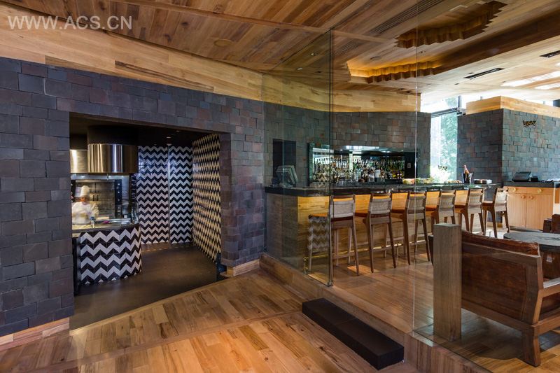 Aside this space, visitors can enjoy the dining area which is conformed by a series of tables and chairs designed exclusively for the project by mob studio: leather upholstered stools, chairs with wicker weaved backrests and geometric pattern decorated surfaces inspired by pre-Columbian cultures.