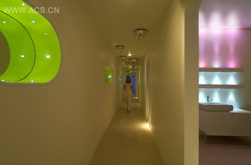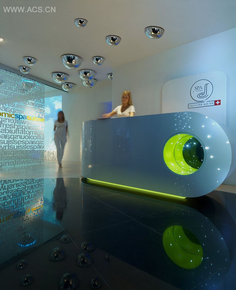我跟安吉洛·博斯科洛开了好几次会,他再次向我提出了想要创造一个更够触动人们感受、引人入胜的空间的想法,这个空间能够覆盖所有的知觉感受,它能刺激人们的身心知觉,这个想法也就是此温泉疗养中心的构思来源。室内设计师阿里亚为安吉洛实现了这个想法,这个温泉疗养中心旨在用一种潜意识的方式带领客户进入另一个维度,这个维度是一个超现实、超自然、不可能的空间,它能将用户们的体验化为积极的回忆。在这个包裹式的空间里,人们仿佛置身在一个与现实对立的世界里,他们能在此发现自我,建立一种全新的身心平衡。空间里的所有构成元素都包含了此信号。整体的效果,例如灯光、材料及颜色都让它成为了一种不稳定的信号,它强调了人与空间、人与时间、人与现在及未来之间的新关系。