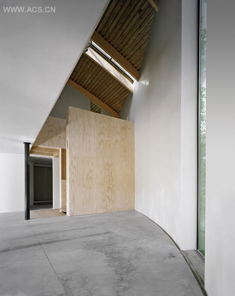 这栋三面种着绿色植物的住宅位于比利时布鲁塞尔小区,是一位艺术家的家。整栋建筑在原来老建筑基础上扩建。老建筑拥有入口大厅,家庭娱乐室还有厨房,客厅和楼梯是额外扩建的部分。二楼则包含主卧套间以及5个孩子的卧室,每个孩子的卧室都有一层拉着纺织网的夹层,而改夹层也影响了整个建筑的形体。建筑就像一个半圆形,面朝邻居的弧状墙面是封闭的,而面朝内院的西向直墙则是开放的玻璃墙,在夏季,可以拉上白色的窗帘隔绝从西面射入过多的阳光。