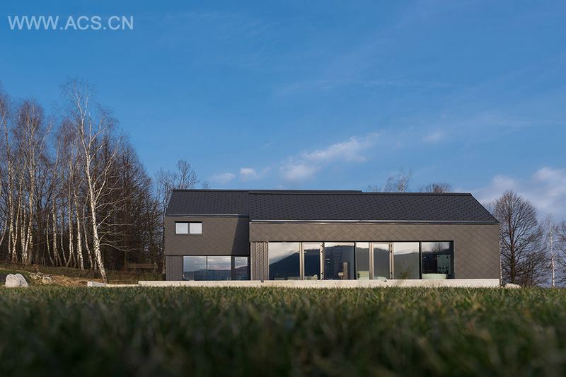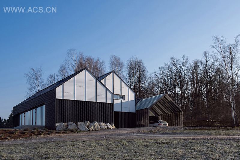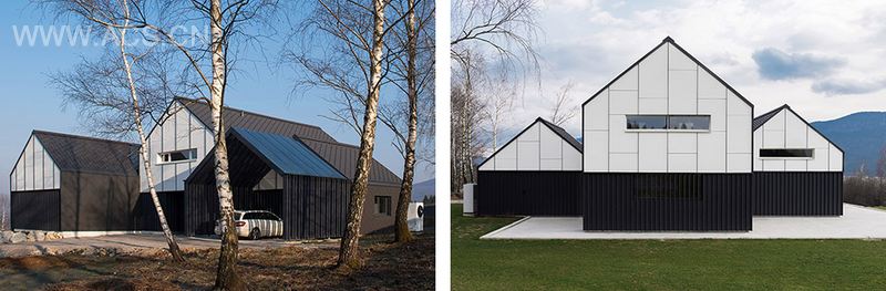M住宅是一栋斯洛文尼亚风格的住宅建筑,三条带有标准尖屋顶的长方体体量并置且前后稍微错开,整个住宅的外立面的色彩为深色,除了侧面山墙采用了深色和浅色的组合(木板与纤维水泥板)。沉稳的色调十分协调与周边的桦树林和风景相融合。