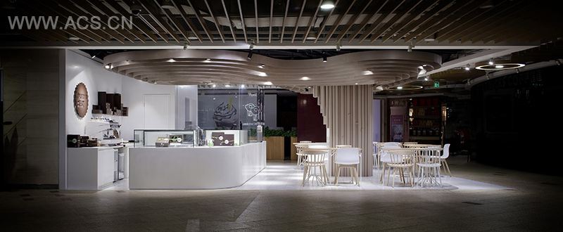 这店铺选址于尚嘉中心店地下二层,场地中间有一个巨大的柱子,芝作室将此难题视为一个进行“塑造”实验的好机会:把这个柱子变身成为一棵从地面延伸到顶部的大树干,在空中展开成为一个蜿蜒盘曲的“大树荫”,模拟蛋糕的糖霜顶部装饰。内嵌不同蛋糕图片的“观察孔”高高低低地分布在树干上,好像啄木鸟留下的痕迹,激起行人的童真与好奇心,邀请他们前来看个究竟。