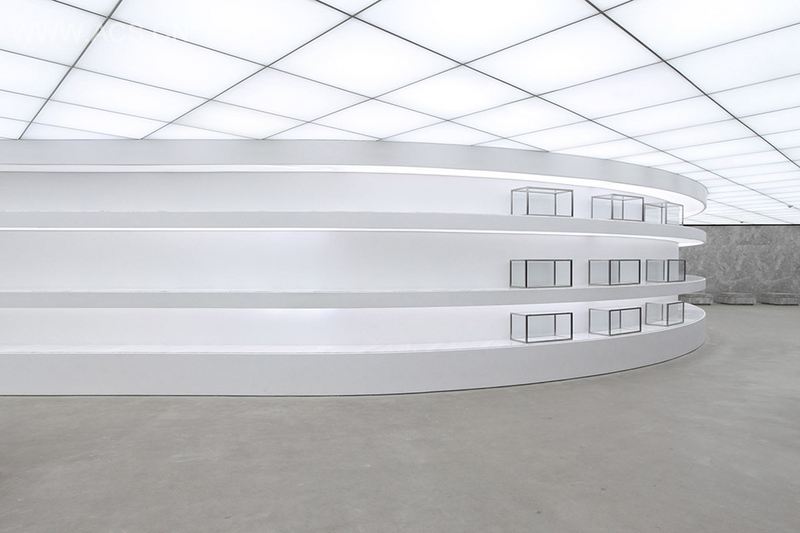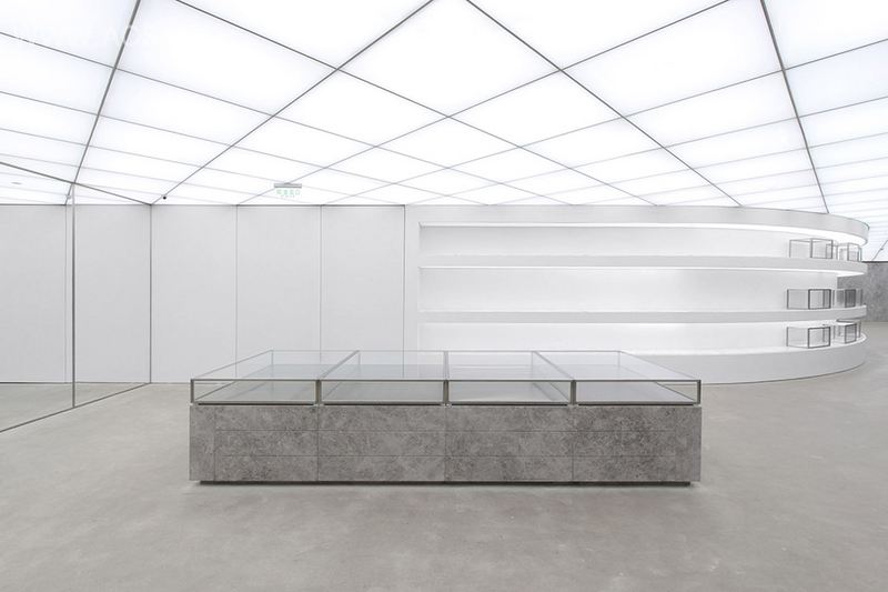 曲墙是店铺中倍具张力的品牌展示墙。上方的天花板则如同一个光盒,散发着均匀的白光,同时天花网格与店铺的方形与菱形形状呈45度交角,协同墙壁,镜子,服装导轨成就一个暧昧的几何集合游戏。人们在最初入店时,天花与空间其它要素还呈现出45度交角,但是往里走,天花又与店铺墙壁呈精准完美的直角相交。