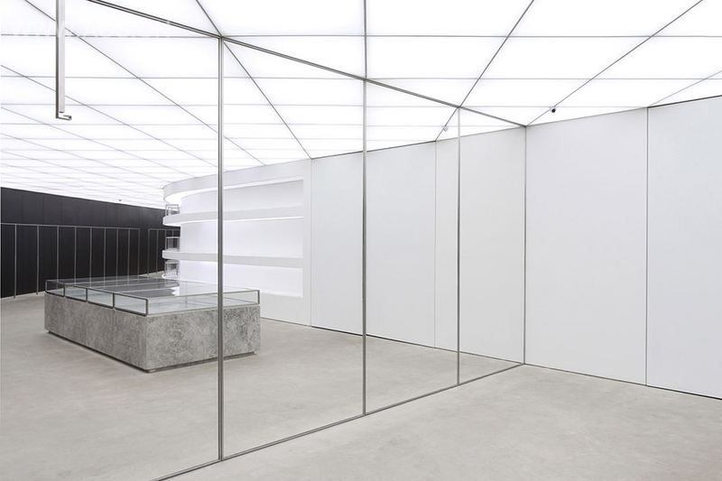 弧形墙壁引导客人深入店铺,到达私密的店铺的心脏,一根20米长的钢轨衣挂,上面挂满了服装。除了洁白的曲墙之外,店铺的墙壁要么是玻璃要么就是深灰墙面或者黑色金属墙面。黑色的金属墙面正对曲墙,这段30米长的黑墙背后隐藏了2个10米长的更衣室,虽然只有1.5米宽,但设计师在其中巧妙的运用了镜子。墙体和整体经过设计师的精心设计,产生了让人意外却又和谐的相互作用。