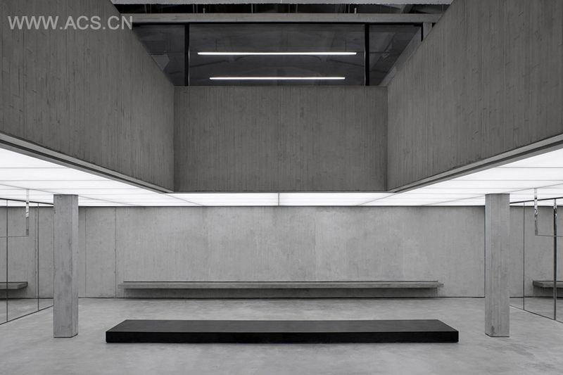 与楼下封闭的外太空式展厅相比,楼上的办公和管理空间则显得开放得多,自然光充盈其中。工作台与地面的材料一致,由灰色混凝土打造,精致的工艺使得桌面非常光滑。每一排桌子之间用两米高的黑色金属柜隔开。工作室的尽头还有另外一段楼梯通往一层的制作工作室(一层制作工作室与展区不相通)。