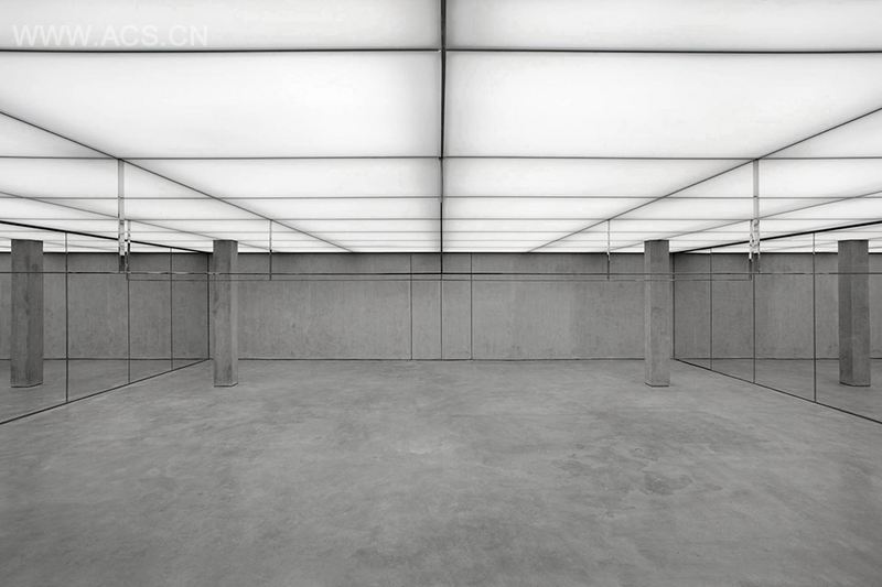 这是一个在材料使用上极为克制的室内空间。最少量的使用材料,创造出一个清晰的整体空间。陈列室,办公区,工作室,管理区这四大区域独立并关联。陈列展区是整个空间的核心,这里就像是一个科技感很强的封闭盒子,从天花上照射下的冷光与灰色的基调协作,仿佛外宇宙的传输站,在这种单纯中性的整体空间下,客人们更容易将精力放在品牌展示物上。墙面上的镜子将空间放大无穷倍,结构柱映射其中就如同古代神殿或者希腊神庙的壮观柱列。一段楼梯,是通往上方的“唯一”出路。当把一层的灯关闭,从楼梯井上射入的天光也足够将空间照亮。