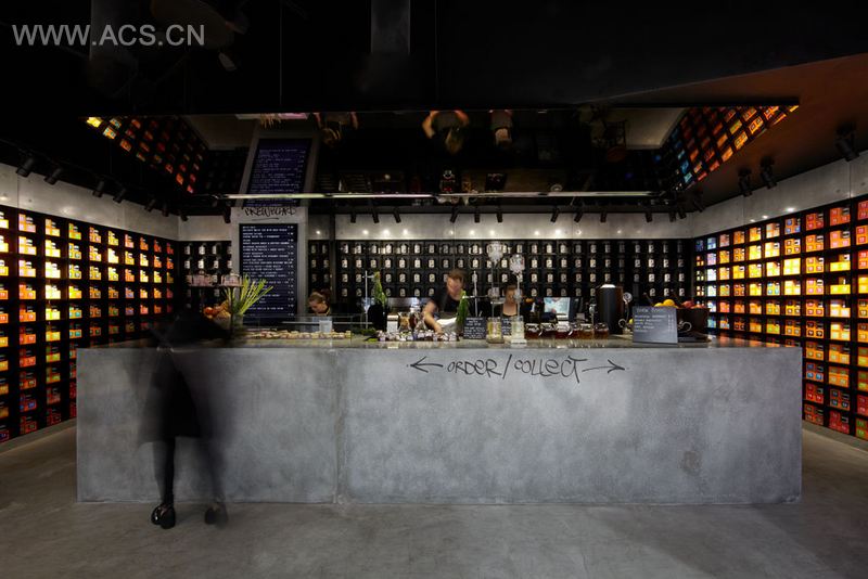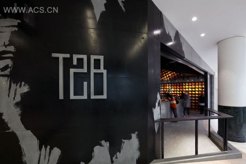 本店是想象力的结晶,在这一视觉上充满挑战的环境中,歌颂了T2团队的专业及其对茶的热爱。Landini Associates设计公司证实了这一理念。巨大的模塑混凝土吧台以戏剧化的方式展示了茶的制作过程,店内还可以让顾客自行体验泡茶。为了创造更多的戏剧性,成一定角度的镜面天花板被安置在吧台上方,导视标识是在混凝土上压制出的字母,被巨大的表现主义的绘画包围着。