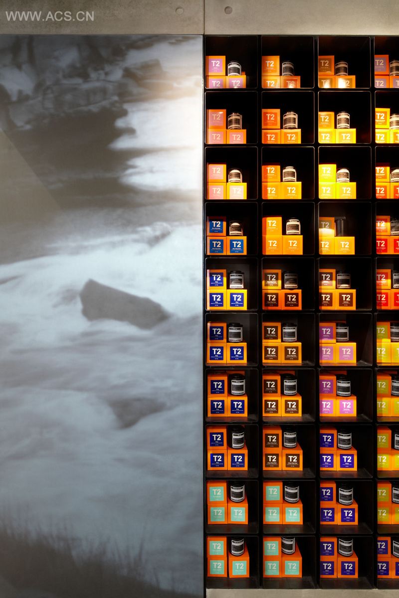 另一个特色是茶的图书馆,位于店面后方,由黑色的氧化的铁架和容器制成,深色的色调使得T2品牌橘色的包装在灯光下引人注目。
