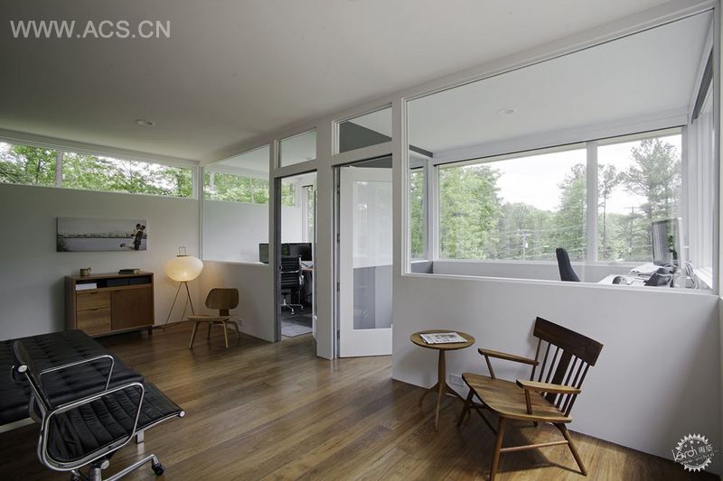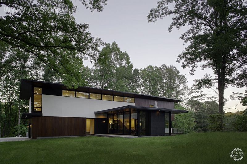 房子的南北两端分别是森林和池塘,二者美丽的景观都被尽收眼底。传统日本元素玄关等被融入了现代的室内设计中。精致的起居室和餐厅从主体空间向西南延伸。这个空间被一个大屋顶和三棵大橡树所遮蔽。依偎在房子和山体之间的凉亭提供了比普通的玻璃建筑更多的私密感。