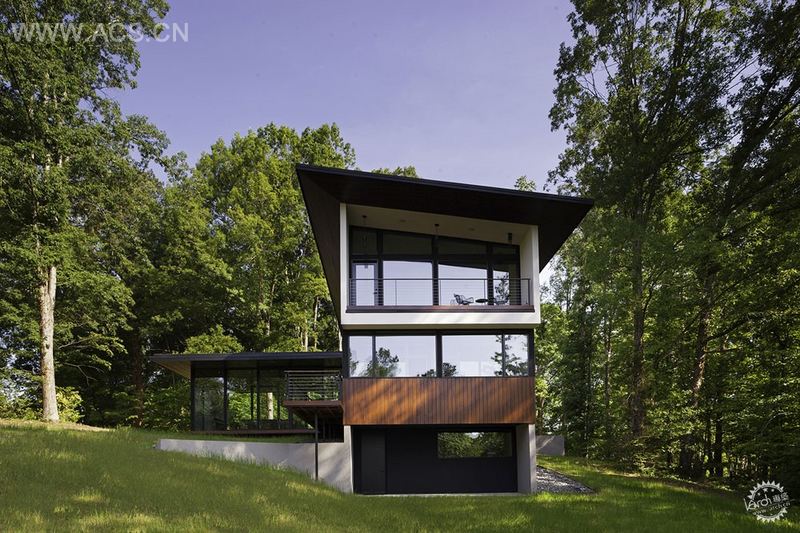 该建筑是在混凝土地基上建造的木质结构。钢材屋顶向外延伸形成悬挑并延伸至池塘,这样房子显得很轻薄。建筑外立面由粉饰灰泥和当地的柏树皮构成。相反,起居室和餐厅主要是由四周的玻璃,和由一根细长的钢柱和壁炉架支撑的薄屋顶构成。围护结构用泡沫密封保温。所有的机械设备都在地下室,包括地源热泵、高效热泵和一个用于所有家庭照明和家庭自动化控制的机架系统。虽然房屋的照明系统很复杂。但天气好的时候,房子可以开放,由此接纳的自然光就足以取代人工照明。