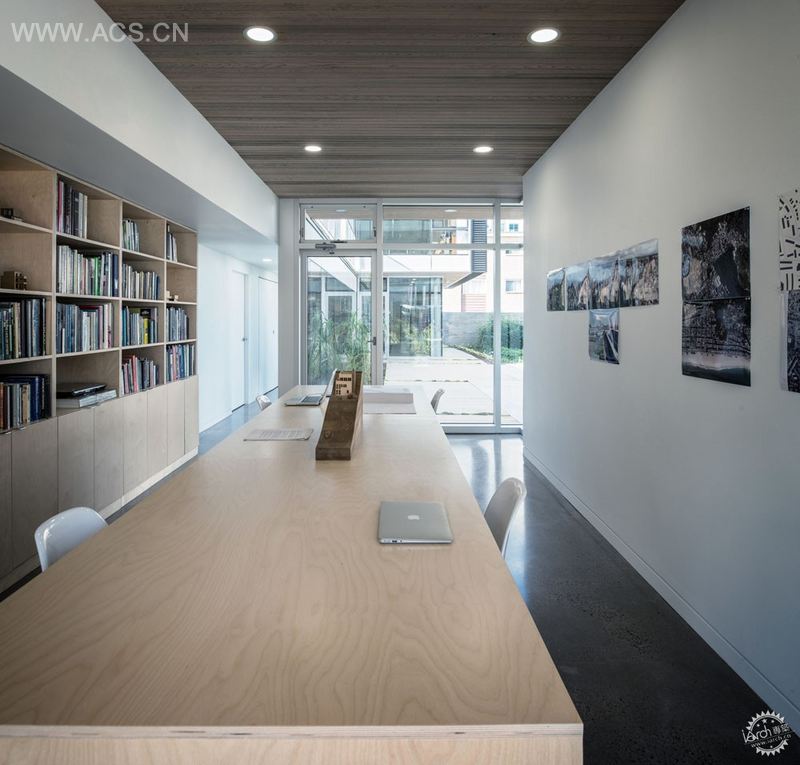 木纹水泥和水纹钢构成附近工业屋的建筑语言,预算也制约着项目。水泥条板和墙既用作结构也用作外观,在一天中通过电气计量提供被动的太阳能热源。木质露台、拱腹和楼梯在建筑中暴露无遗,在屋顶放置了花盆,楼下则有花床。