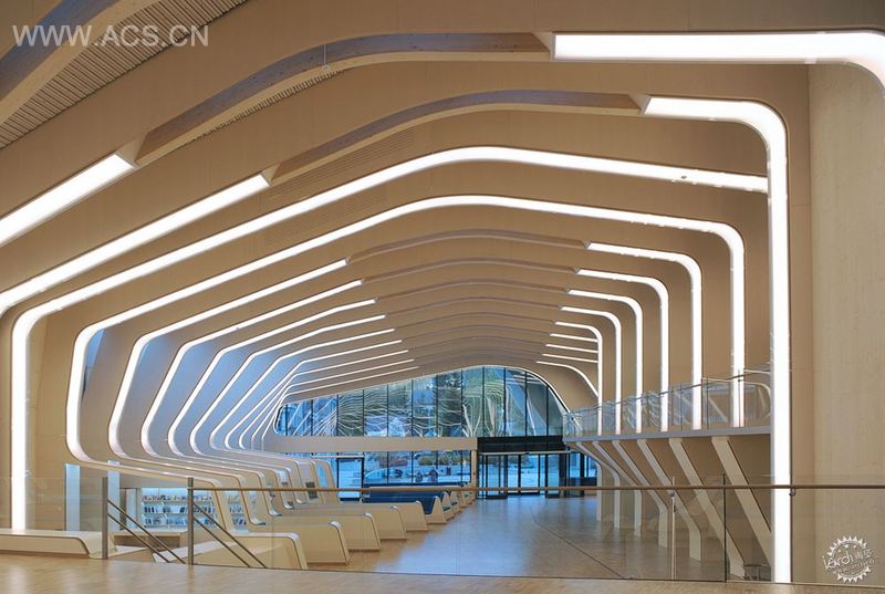 木梁实际上是由胶合木材和数控制造胶合板构成,前者是主要结构,后者创造了导管综合体围墙。鉴于这些梁具有照明、机械、和图书库功能,而不只是结构,所以很有必要将这两种木材综合起来,算上梁之间的CLT地板和横梁的话就是三种材料。