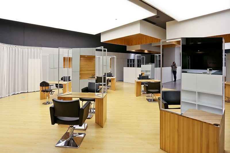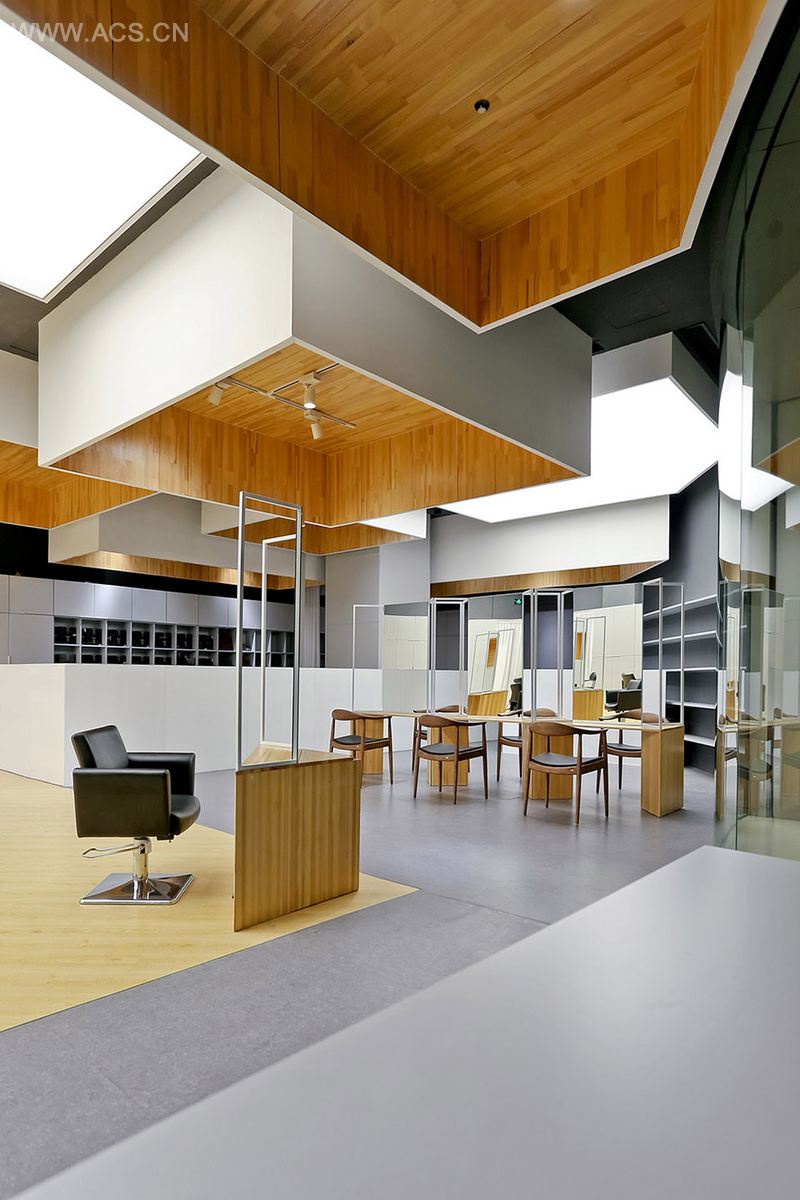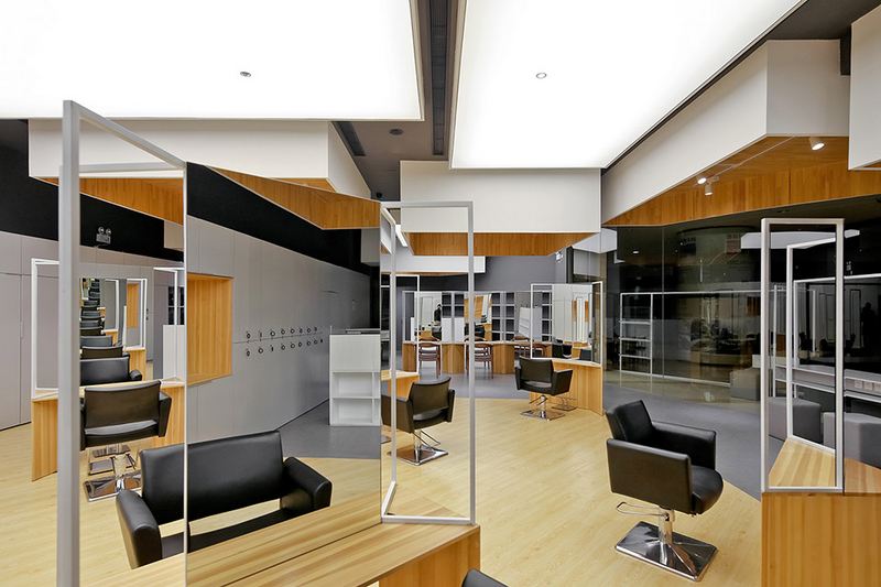 项目位于杭州万象城,店铺单元本身为不规则形平面,我们不希望店铺的边界成为空间上的制约因素,而是要创造一个流动、均质、可无限延展的单纯空间。设计中使用的材料本身并不花哨,仅用来表达抽象的形体及其内外关系。连续变化的吊顶、安装其中的射灯及整片的光膜暗示大空间内含有的多个功能分区。剪发区被放置在店铺最显著的位置,顶部覆以大面积光膜,照度与显色性俱佳的灯具既满足了发型师的工作需求,更使整个剪发区呈现出舞台一般的效果,发型师即舞台上的主角。45度角放置的剪发镜,使发型师的每一次表演即使在店铺外也可被感知。镜柜的设计以整体空间感受为出发点,镜面与镜框的组合只反映出空间本身所存在的反射与穿透的关系,镜柜在空间中的存在感被弱化,人及其行为成为唯一的焦点。