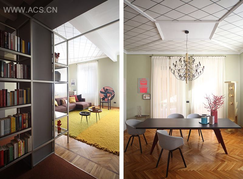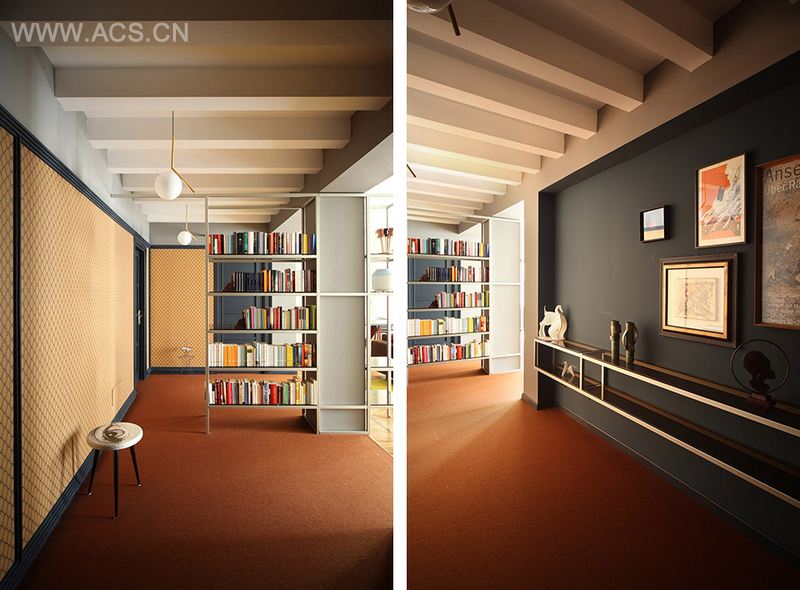 古典,鲜明,灵动又让人回味。金属条构架系统蔓延在房间各处,组成储物框架(入口处书柜和摆放架)或者限定空间(卧室),并成为空间造型的主导部分。整个公寓用色丰富活泼,精心配制的名师家具(有 Prouvé, Sarfatti, Mendini 和 Tom Dixon等人的家具)让空间高雅。