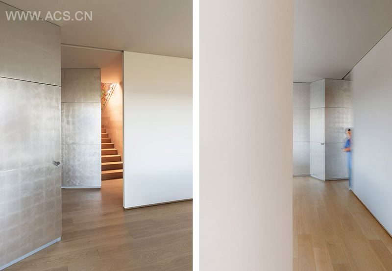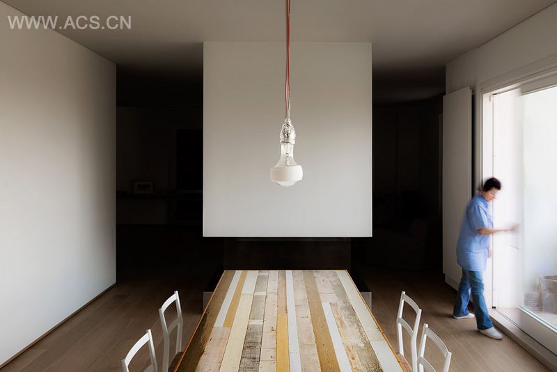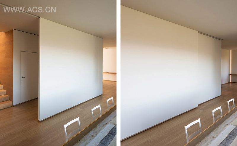 建筑师为这套老公寓配置了白色大面板推拉门以及大量的带推拉门的转角贴墙储藏式家具,营造出多变的空间和完整清洁的居住空间。木材是整个改造项目的基础材料。地板和储物家具都有使用到木材。联系客厅与家庭影院的墙上有一组有趣的木材储物摆设家具,它沿墙前行,上下凹凸波折,有的地方能用做桌子,有的地方则可用作凳子。