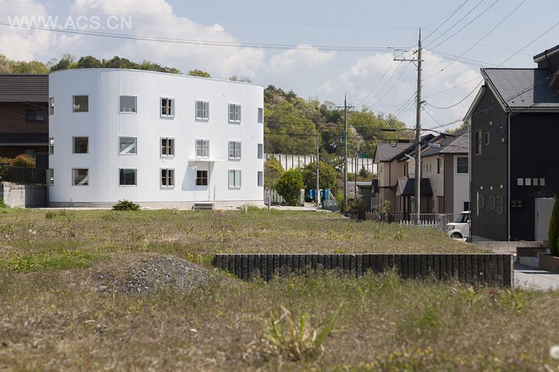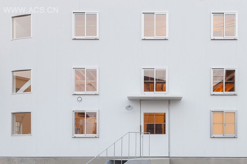因此我们设计了带有42个窗户的白色椭圆形圆柱体,并在室内设置木盒状物以及地板,创造一个居住空间。建筑呈对角线建造,与周围住宅形成一定空间距离。许多窗户分隔开周围环境。还恰到好处地增补了一些不可见的部分,形成通透感。外墙上,窗户玻璃整齐排列,协调了各种居住问题。