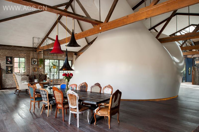 The glass reinforced foam structure is self-supporting and stands on the original floor like a piece of furniture albeit a rather large and heavy one. The pod contains a sleeping space, with a large bed integrated into the shell, a day wardrobe/entertainment unit and a bathroom.