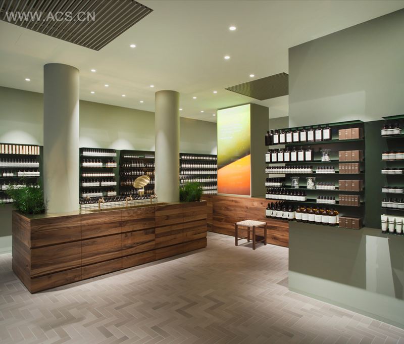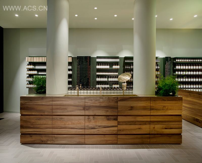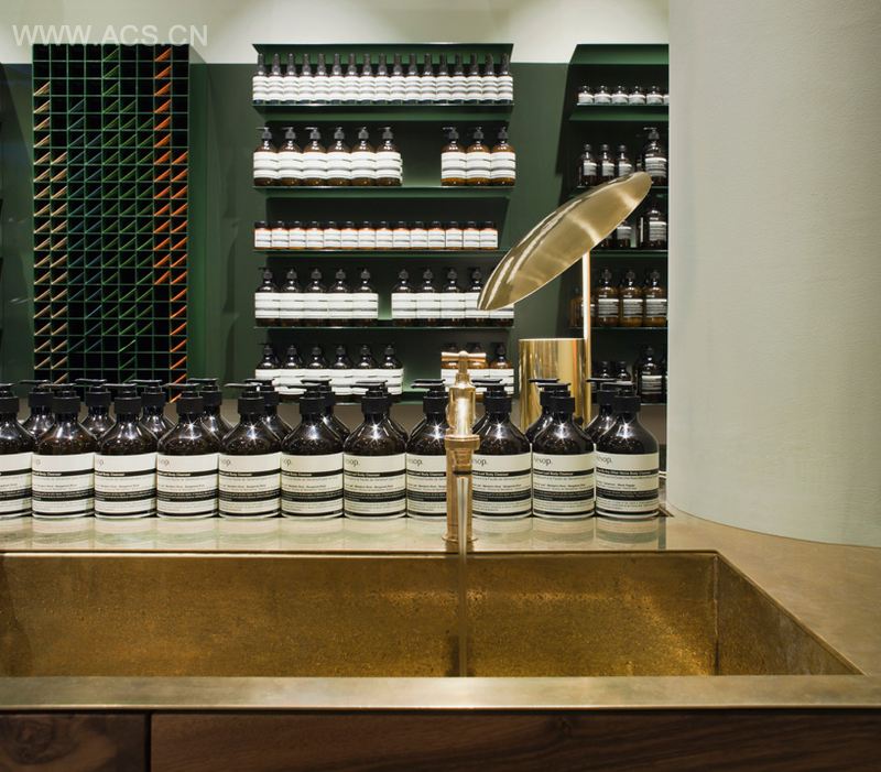 建筑采用背光货架与浅灰绿墙,以聚焦于aesop的系列产品。集合了一个多用途的原铜水槽的整体实心胡桃木结构在这一自然背景下变得更为突出。因此,这一特性成为空间中的核心元素。灰色亚光地砖是参照法兰克福地区的典型特色砂灰和盐釉炻器陶瓷的结果。