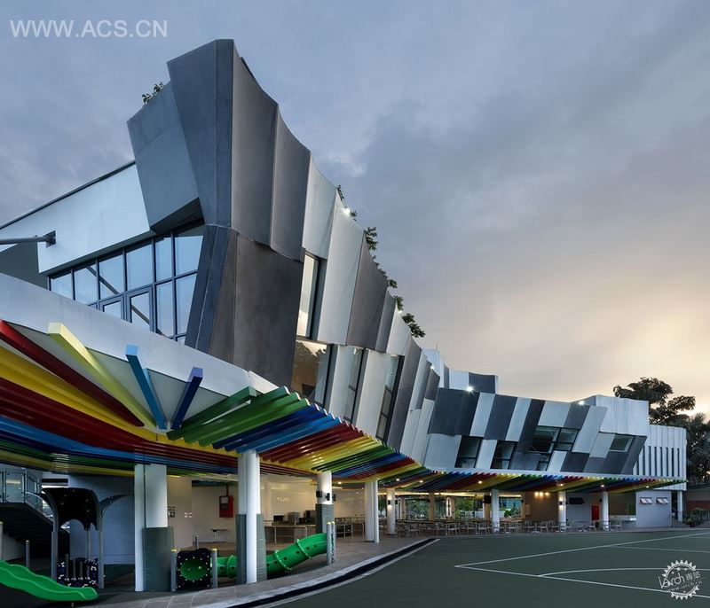 第一阶段是为家长设计自助食堂和一站式中心。设施位于有屋顶花园的两层高新建筑上,还有一条通道通向学校,给学生和家长带来方便。