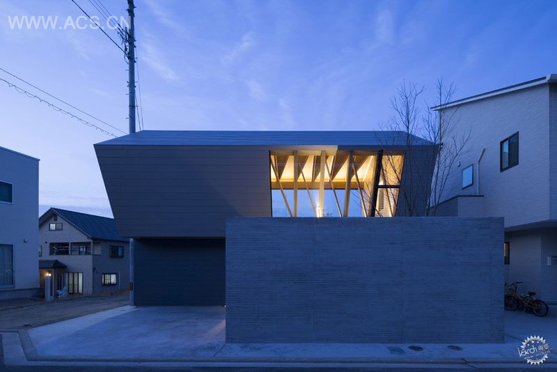 木门里是门厅,以钢筋混凝土墙包围,在晚上用间接照明迎接主人。艺术楼梯采用悬臂式钢结构,位于入口大门的后面。柔和的散射光线从格栅照下来,照亮了紧邻浴室的庭院空间,浴室位于住宅内部。所有的一楼空间,包括私人房间和浴室,都朝向内部庭院。正面用日本紫茶树来突出,树木种植在儿童房外的庭院里,成为住宅的标志。
