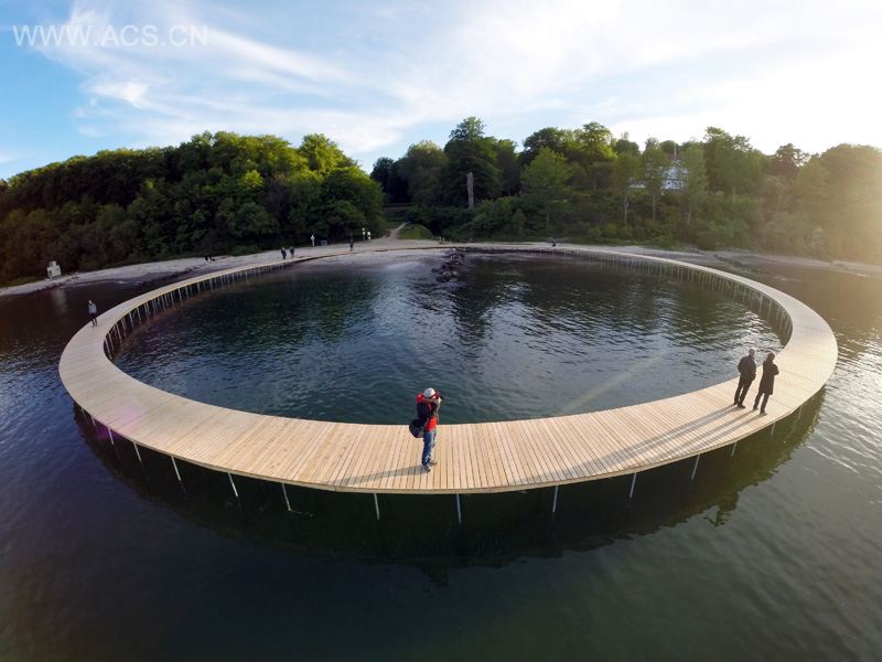 “The bridge touches the landing dock of a previous pier located at the site where people used to arrive in steamboats from the city to relax and enjoy themselves. The historic Varna Pavilion that sits on the hillside above the beach was a popular destination in the scenic landscape with its terraces, restaurant and dancehall.Situated on the edge of the forest facing the sea the pavilion was meant to be experienced from the landing dock of the pier that no longer exists. The Infinite Bridge reestablishes this historic connection and offers a new perspective on the relation between the city and the surrounding landscape,” says Niels Povlsgaard, partner and co-founder of Gjøde & Povlsgaard Arkitekter.