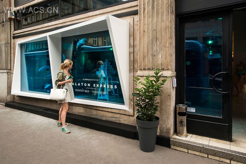 The aquarium look also comes from the blue foil that the glass is covered with. Looking in from the outside it seems that the whole store is under water.