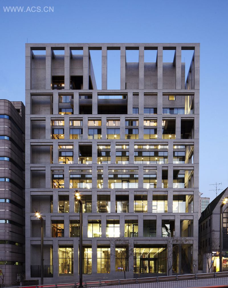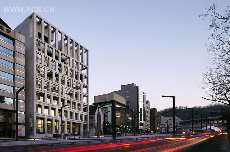KHVatec总部位于韩国首尔艺术中心附近,其设计从2010年便开始,容积率从2.5--4之间拥有可变动性。业主希望建筑师遵循以下三点进行设计:1 与周围协调但又要树立公司品牌形象;2 限制开口保证企业安全; 3 与附近的首尔艺术中心和谐,设置画廊和小剧场,体现出深厚的文化背景。