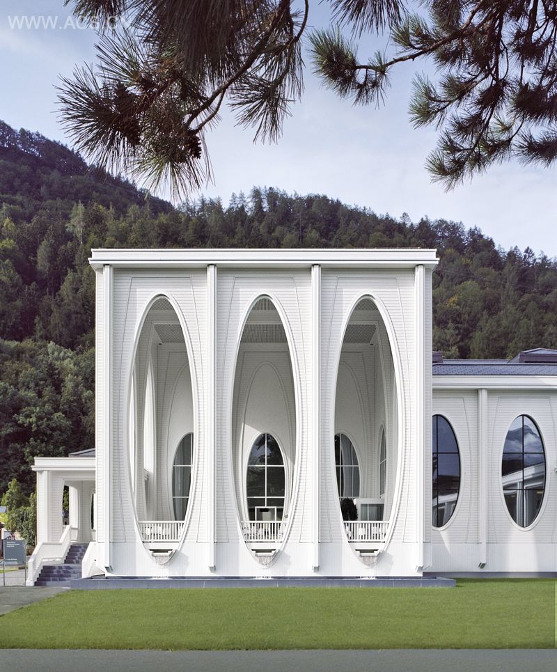 也正因为这个原因,这些建筑群形成了一种不朽的特色,由此让这个度假村从其他相同性质的建筑中脱颖而出。与此同时,温泉浴场的设计也意图与近乎“都市化”的浴场大厅的石雕工艺相对应。温泉浴场里采用了雪白的木质材料,它们给度假酒店塑造出一种像帐篷造型的特点。