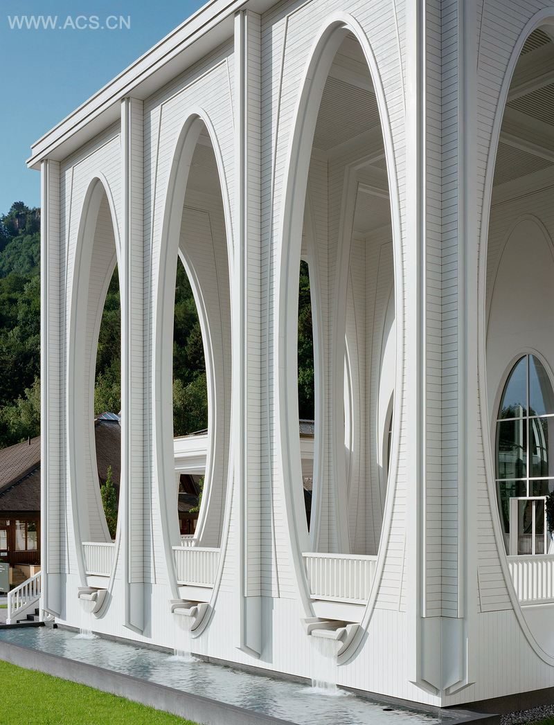 建筑的木结构不仅仅是由支撑物的跨度标准决定的。它并未过多地聚焦在支撑物的作用及结构的加固上,而是更加专注于其空间感,以此创造出一种美丽而庄严的氛围。在这里的温泉浴场沐浴是一种绝佳的享受。