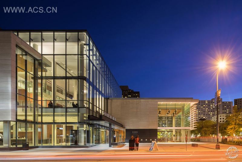 新建筑所体现出来的清新、与时俱进、开放型美学与原始的音乐厅形成一个鲜明的对比,同时也肯定由20世纪一些先锋建筑师设计的现代主义色彩的市中心建筑和公共空间,在现如今仍具有重要地位。扩建部分所使用的外部材料构成了一个城市文脉调色板,这些室外材料包括在建筑上端部分使用阿拉巴马州暗银色石灰岩面板,并覆盖亚光表皮,而在基础部分使用米萨比黑色亚光花岗岩。新建大厅通体透明,从地板到屋顶都使用玻璃墙,展现着室内活动,捕捉到明尼阿波利斯市的天际线,并向周边输入新的能量。11号大街的陡坡被转移到西边,凭借其宽阔的人行道和两侧的树木将Marquette大街连向Nicollet购物中心,将音乐厅纳入到城市肌理中,使街景焕发新的活力。这样设计塑造出一种形象—— Minneapolis是一个适宜步行的国际性城市,音乐厅是一个开放包容的目的地。