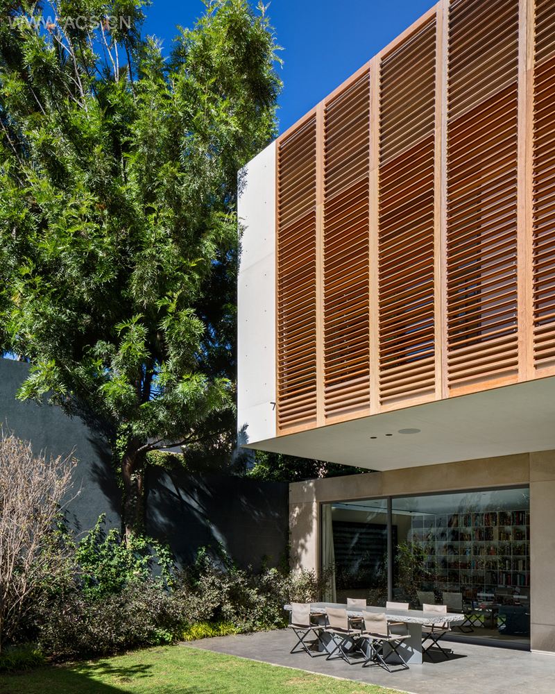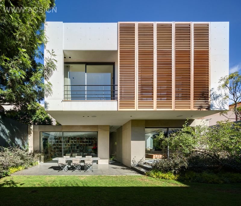 因此,这些体块之间的负空间形成了别墅的流线。主楼梯位于这栋两层别墅的中部,连接着别墅的公共区域和私密区域。融入侧面墙壁的一扇白色百叶窗阻挡了照射进来的阳光,在一天内创造不同的氛围。