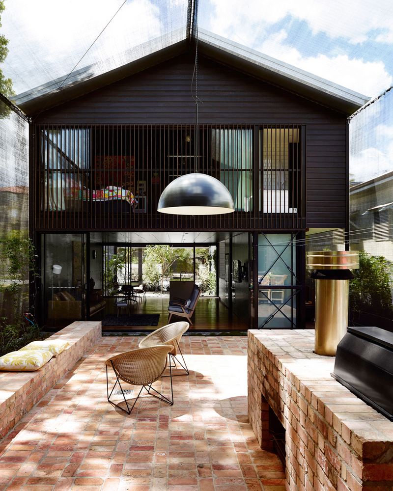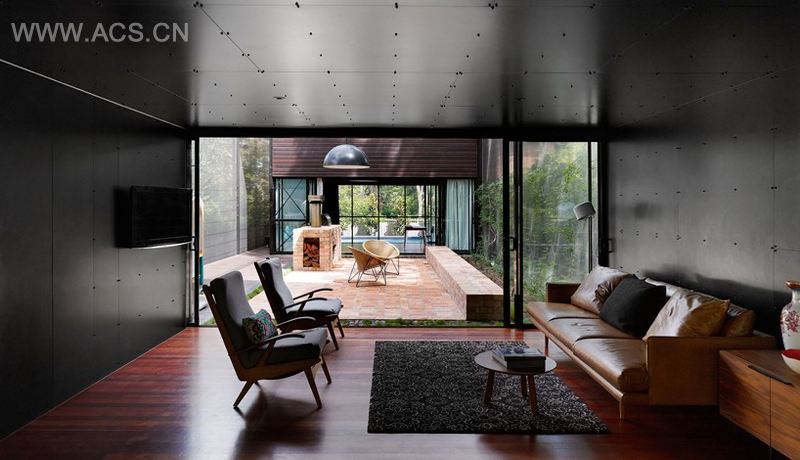 在室内,墙壁被黑色的三聚氰胺甲醛树脂装饰材料包裹,地板则采用暖色系的木板。两座“楼阁”中的第一座囊括了起居室、儿童房,另一座则被布置成主卧室。私人住所被安排在上层空间,院落被设置在核心区域,这样的做法不但在室内和室外之间形成了连续多变的景观,还起到了交叉通风的效果。
