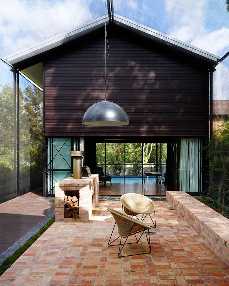 为了应对布里斯班新农场半岛的亚热带气候,澳大利亚james russell建筑事务所设计了这栋“oxlade drive住宅”。这栋家庭住宅被设置为拥有两个体量的一串建筑,坐落于一个景观院落和泳池之间。建筑由突出山墙屋顶的建筑体量组成,有趣的地方是,通过使用帘子布将露台整个包裹起来,将阳光过滤,使其轻柔的照进空间里。这种表皮体现了内外共融的观念,同时还起到遮阳、防止昆虫进入的作用。